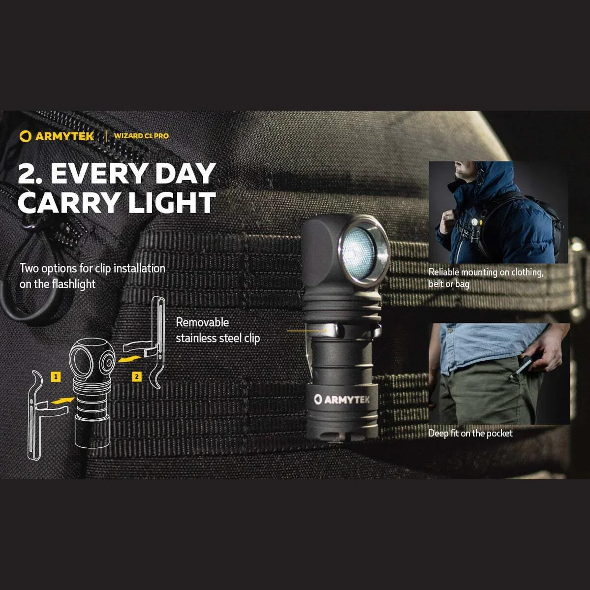 The Wizard C1 Pro securely attaches to metal surfaces with a potent magnet in the tail-cap, while also offering a secure fixation in the headcount and versatile positioning on clothes, belts, or bags via a clip. Additionally, a tailcap hole accommodates lanyards or key rings. The model is compatible with bicycle mount ABM-01 and hard hat mount AHM-02.